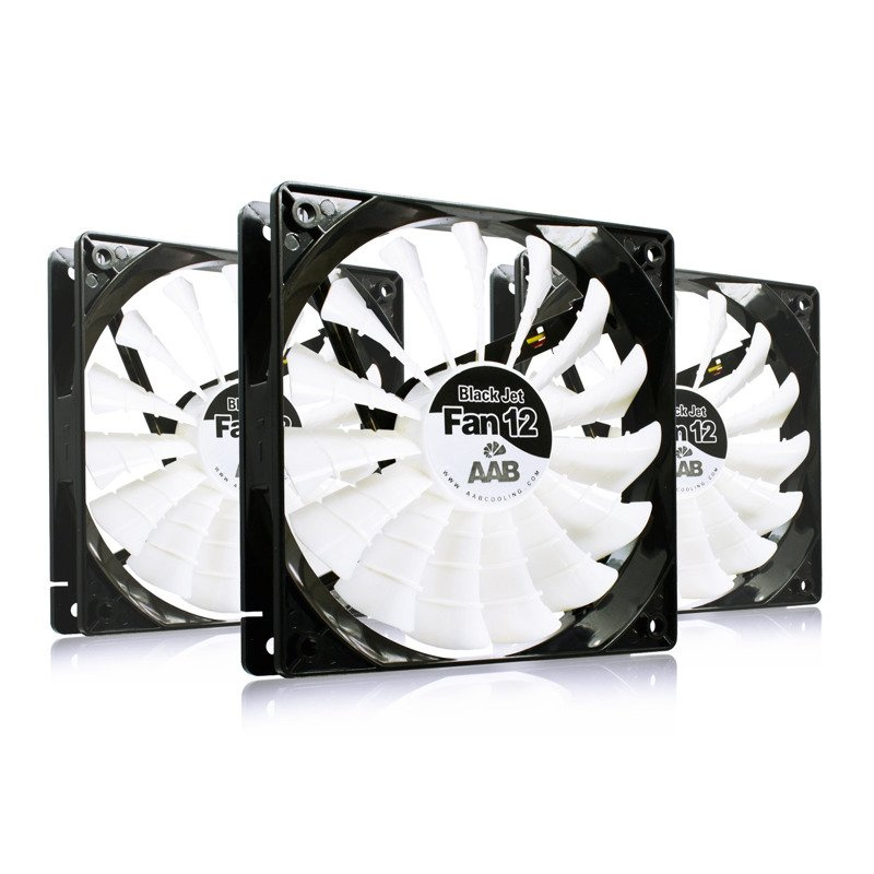 - The AAB Cooling Black Jet Fan 12 is a highly-designed JET-Series fan with up to 15 turbine blades. This allows for significant increase in efficiency (up to about 65%) and noise reduction compared to standard fans.