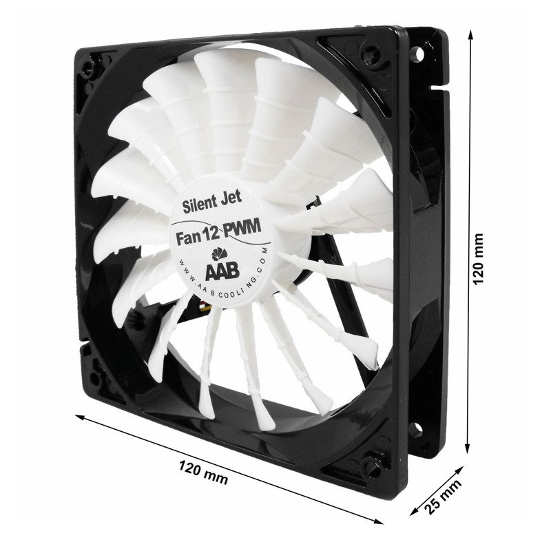 - The AABCOOLING Silent JET Fan 12 PWM is a highly-designed JET-Series fan with up to 15 turbine blades. This allows for significant increase in efficiency (up to about 65%) and noise reduction compared to standard fans.