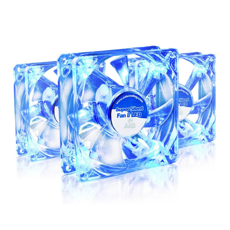 - AAB Cooling Super Silent Fan 8 BLUE LED - ein hochwertiger, lautloser, preiswerter 80mm - Lüfter mit blauer Beleuchtung. In allen Lüftern von AAB Cooling werden die in Japan entworfenen FDB (Fluid Dynamic Bearing) Lager angewendet.