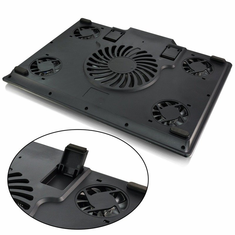 AABCOOLING NC84 Czarna Podstawka pod laptopa która posiada aż pięć wentylatorów! Doskonała dla bardzo dużych notebooków, które potrzebują mocnej i solidnej podstawy chłodzącej. Za wydajne chłodzenie odpowiada jeden wentylator 125mm oraz cztery wentylatory 70mm. Zapewnia stabilną pracę, a dwa przyciski Start/Stop pozwalają na włączanie osobno jednego wentylatora 125mm lub czterech wentylatorów 70mm. Jest również możliwe włączenie wszystkich wentylatorów tak, aby pracowały równocześnie. Dobrze wyprofilowana jest również dolna część podstawy, która umożliwia trzymanie chłodzenia na kolanach, tak, aby korzystać z notebooka również na łóżku. Odpowiednio zabezpieczone są wentylatory, aby uniemożliwić wkręcanie się np. pościeli.