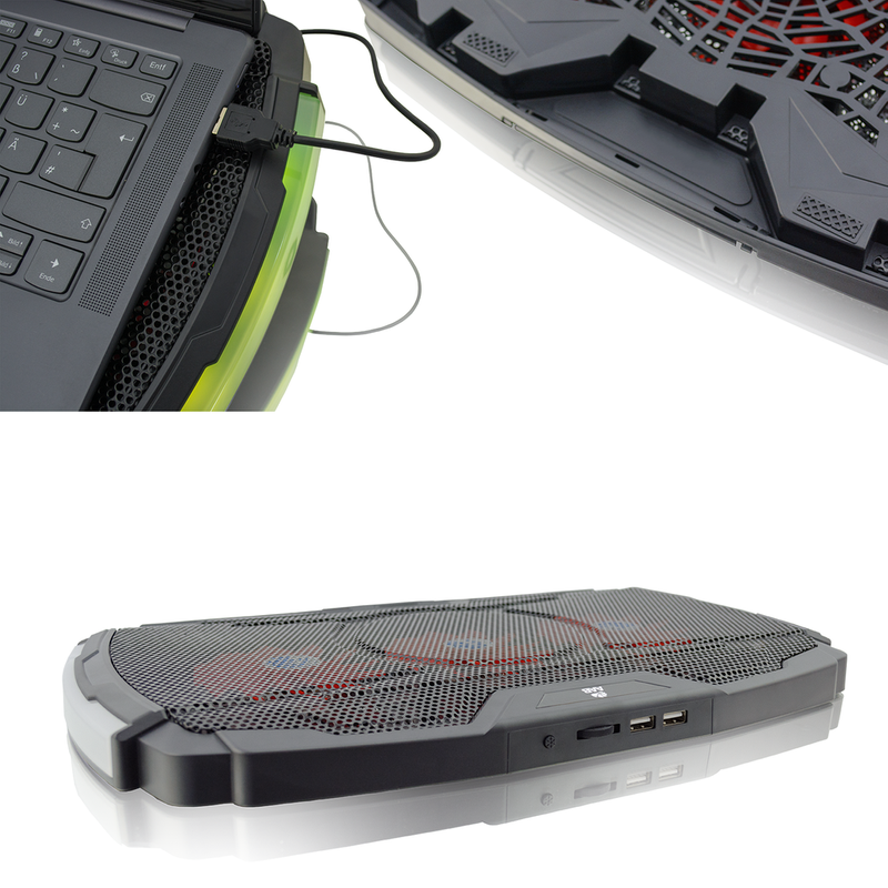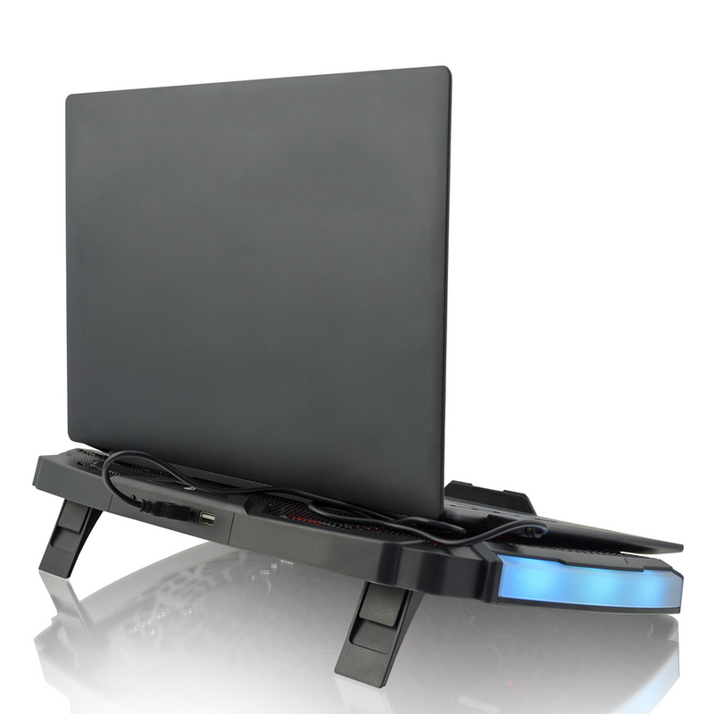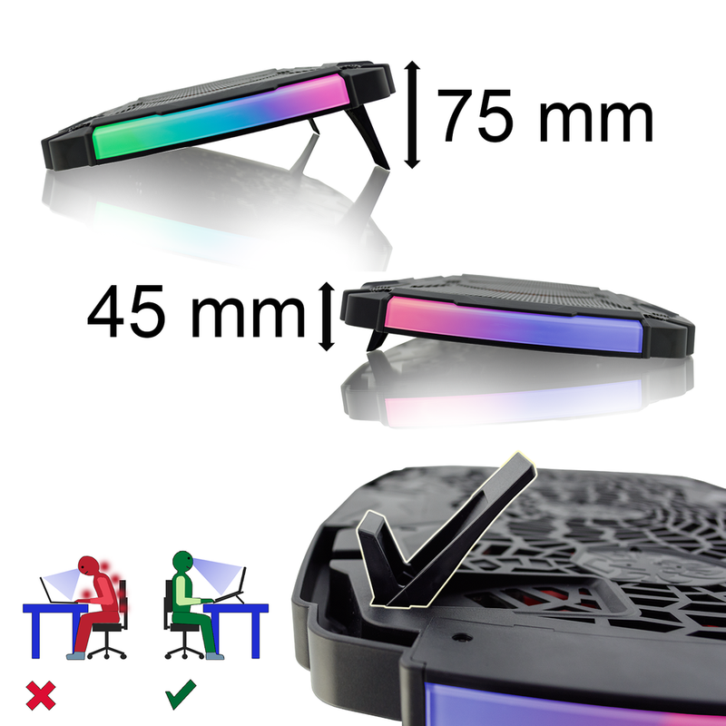Przenieś się w świat rześkiego powiewu powietrza! Wbudowane wentylatory generuje chłodne powietrze zasysając je od spodu i kierują na rozgrzany spód Twojego laptopa. Podstawka chłodząca posiada wbudowany regulator obrotów wentylatorów. Grasz w gry? Potrzebujesz dodatkowej wydajności chłodzenia? - to jest produkt dla Ciebie - ustaw prędkość na MAX i ciesz się najwyższą wydajnością! Dzięki regulacji kąta nachylenia dostosujesz nachylenie swojego laptopa idealne dla zapewnienia największego komfortu tylko dla Siebie.