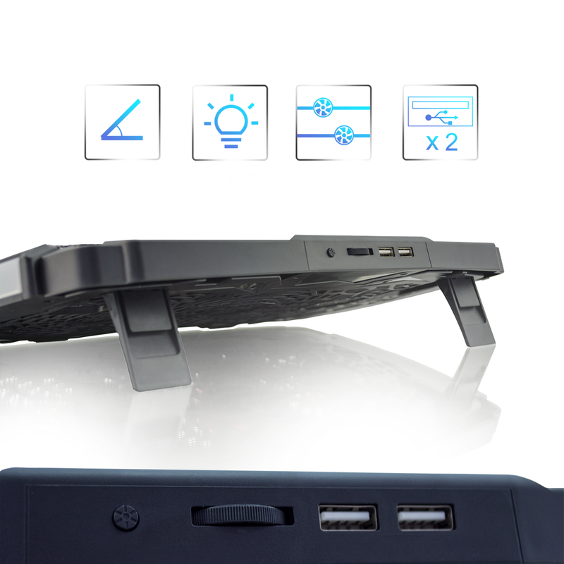 Prosta w użyciu i łatwa instalacja. Na podkładce postaw laptopa i podłączyć kabel USB do gniazda USB. Przekręć potencjometr w prawo w celu uruchomienia wentylatorów i ustawienia ich prędkości. Dodatkowym atutem jest drugi port USB w podstawce, który możesz wykorzystać na podłączenie dodatkowego sprzętu np. myszki czy pen-drive. Podłączając podstawkę, nie tracisz żadnych portów USB w laptopie. Przycisk z ikoną "Słońca", umożliwia sterowanie ledowym podświetleniem RGB (przytrzymanie przycisku przez 3s wyłącza/włącza podświetlanie boczne RGB).