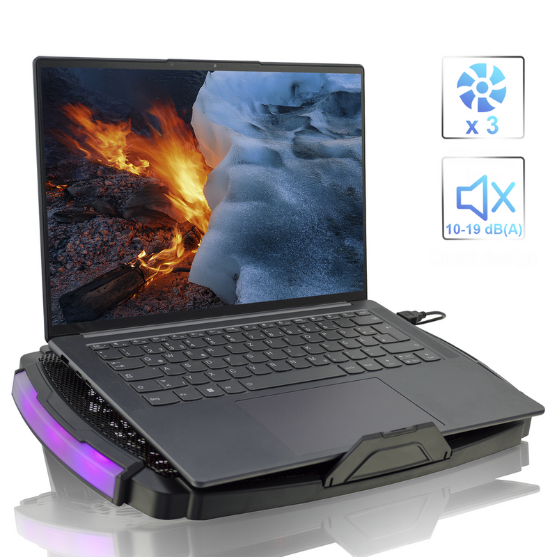 - Vela to lekka podkładka chłodząca do laptopa, wyposażona w trzy wydajne wentylatory i efektowne podświetlenie RGB. Zapewnia efektywne chłodzenie i stylowy wygląd, idealny do codziennego użytku i gamingu.