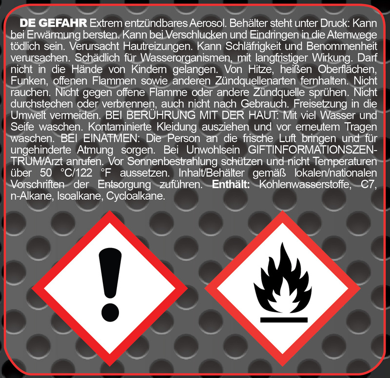 Skrajnie łatwopalny aerozol. Pojemnik pod ciśnieniem: Ogrzanie grozi wybuchem. Połknięcie i dostanie się przez drogi oddechowe może grozić śmiercią. Działa drażniąco na skórę. Może wywoływać uczucie senności lub zawroty głowy. Działa szkodliwie na organizmy wodne, powodując długotrwałe skutki. Chronić przed dziećmi. Przechowywać z dala od źródeł ciepła, gorących powierzchni, źródeł iskrzenia, otwartego ognia i innych źródeł zapłonu. Nie palić. Nie rozpylać nad otwartym ogniem lub innym źródłem zapłonu. Nie przekłuwać ani nie spalać, nawet po zużyciu. Unikać uwolnienia do środowiska. W PRZYPADKU KONTAKTU ZE SKÓRĄ: Umyć dużą ilością wody z mydłem. Zanieczyszczoną odzież zdjąć i wyprać przed ponownym użyciem. W PRZYPADKU DOSTANIA SIĘ DO DRÓG ODDECHOWYCH: wyprowadzić lub wynieść poszkodowanego na świeże powietrze i zapewnić mu warunki do swobodnego oddychania. W przypadku złego samopoczucia skontaktować się z OŚRODKIEM ZATRUĆ/lekarzem. Chronić przed światłem słonecznym. Nie wystawiać na działanie temperatury przekraczającej 50 °C/122 °F. Usuwać zawartość/opakowanie zgodnie z lokalnymi/krajowymi regulacjami. Zawiera: węglowodory, C7, n-alkany, izoalkany cykliczne.