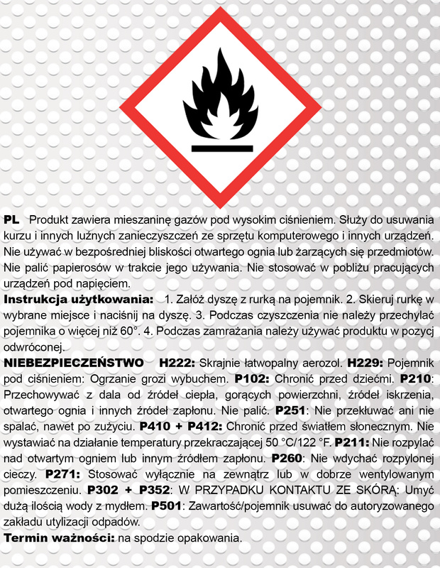 Produkt jest mieszaniną gazów pod wysokim ciśnieniem. Służy do usuwania kurzu i innych luźnych zanieczyszczeń ze sprzętu komputerowego, RTV, AGD i innych urządzeń. Nie wstrząsać pojemnikiem bezpośrednio przed użyciem.