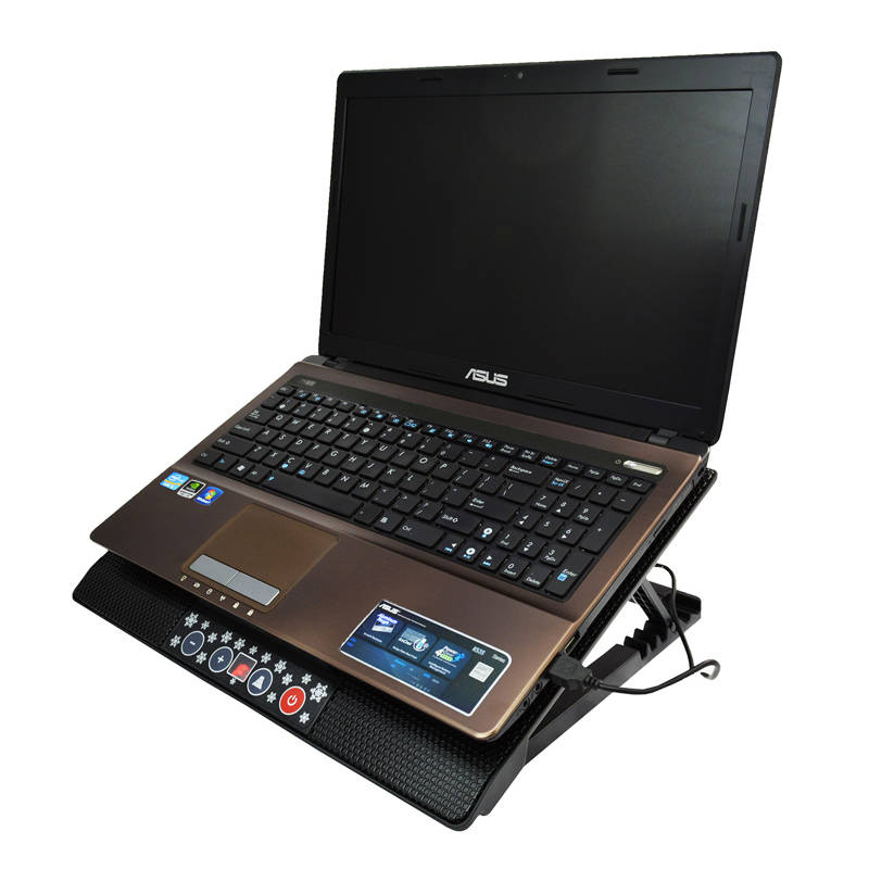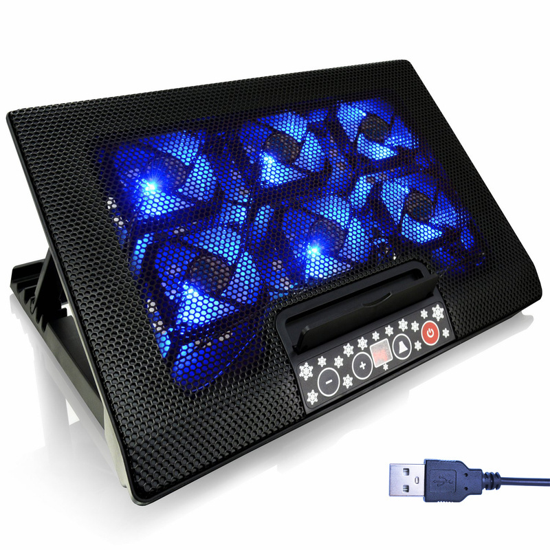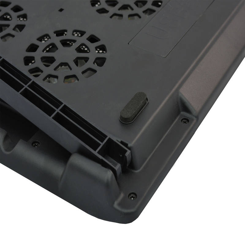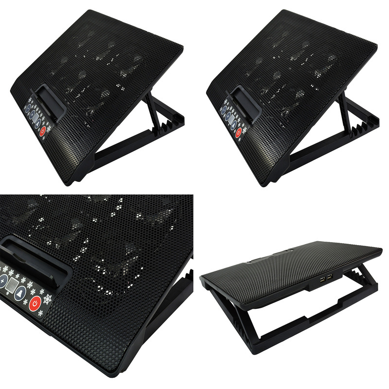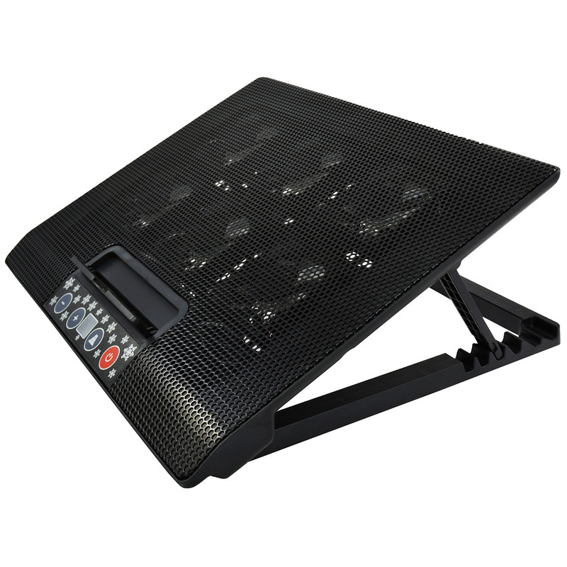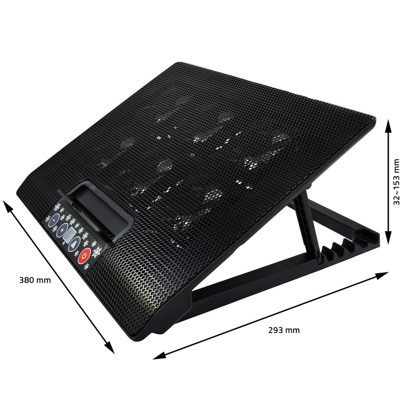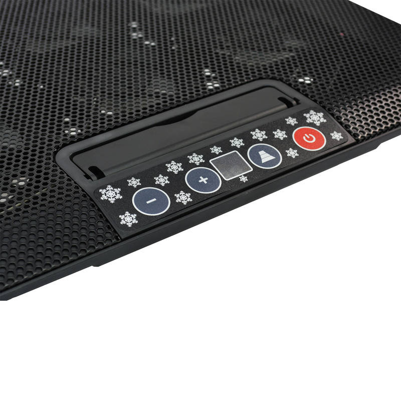 - Cicha podstawka z sześcioma podświetlanymi, wydajnymi wentylatorami z zewnętrzną siatką aluminiową, elektronicznym panelem kontrolnym (cztery tryby prędkości wentylatorów (P1,P2,P3,P4) oraz trzy tryby pracy wybranych wentylatorów ( F1, F2, F3)